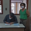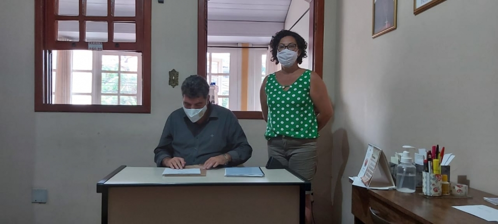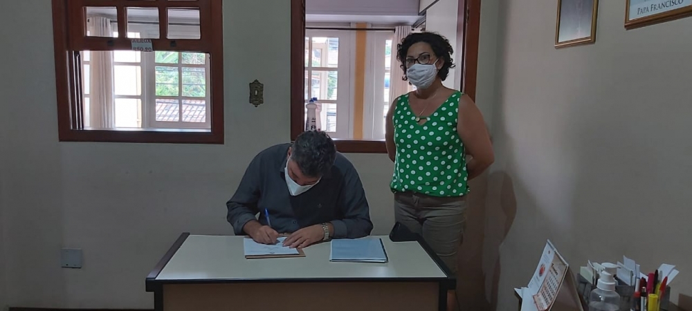 Nas fotos, registro do momento de assinatura da Carta de Adesão pelo pároco, Pe Marcelo Santiago, junto à Coordenadora do grupo, Maria José.