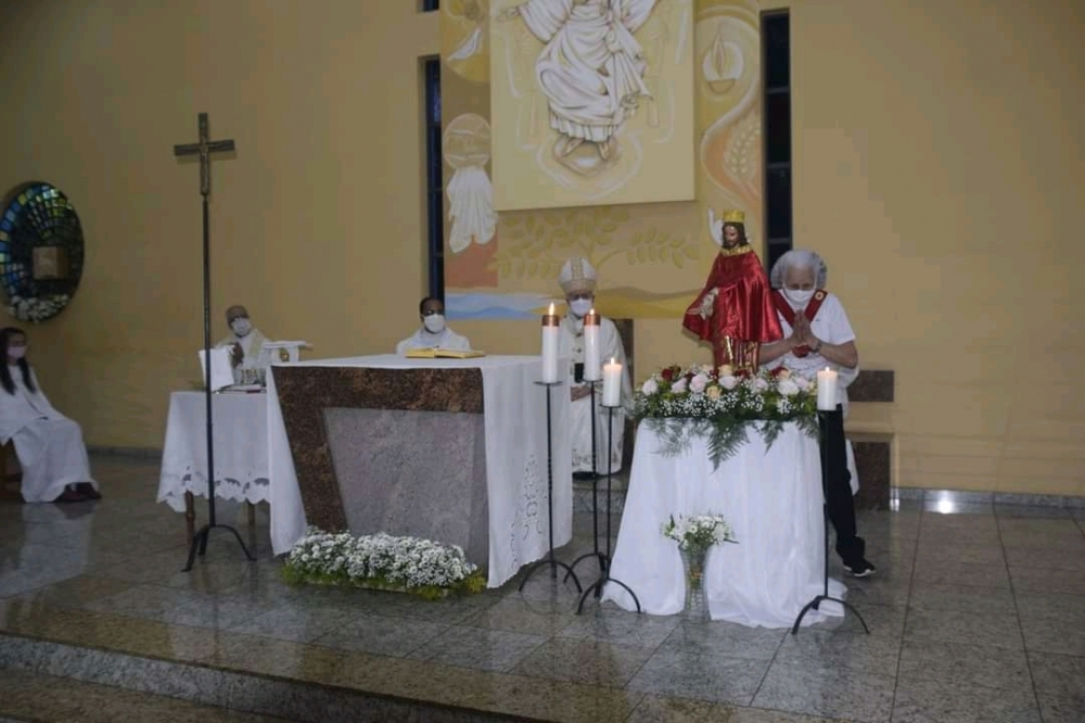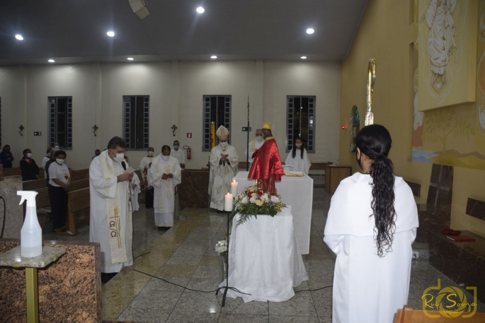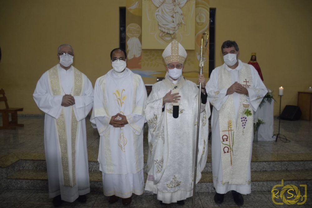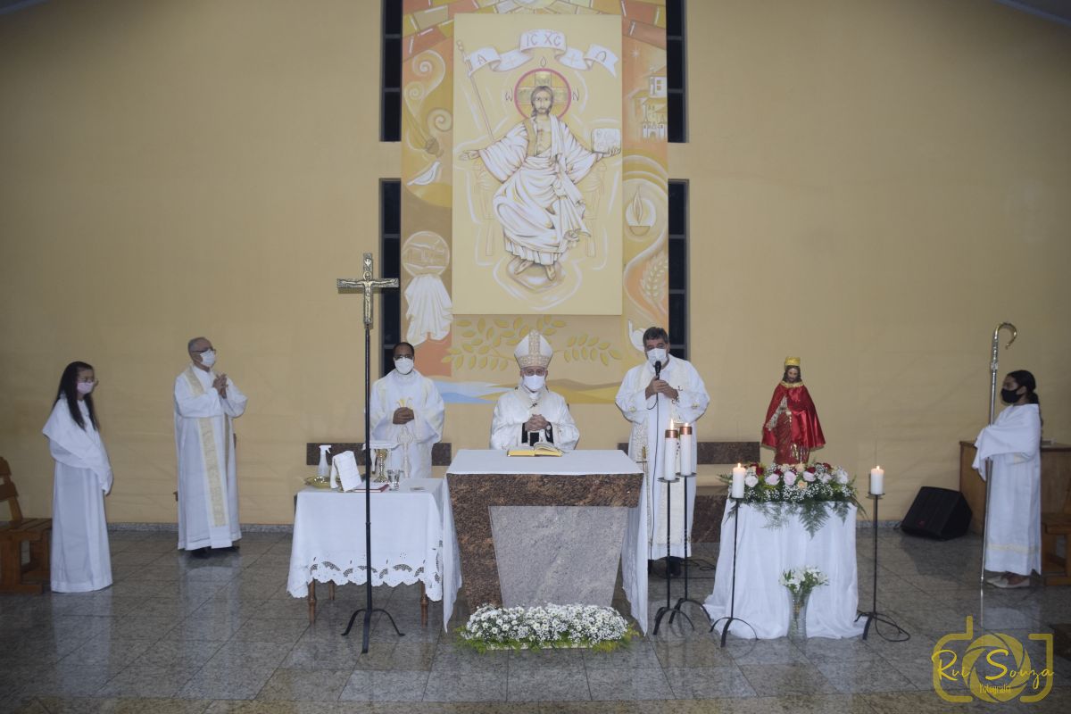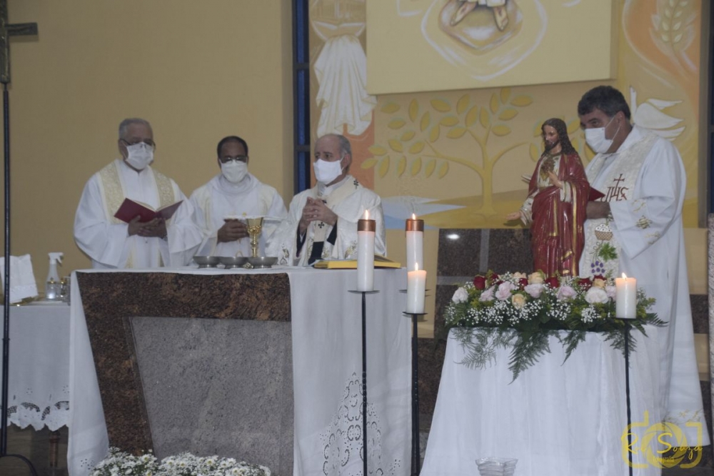A Missa Festiva, presidida por D. Airton José dos Santos, concelebrada por Pe Marcelo Santiago e Pe Enzo Santos, além da presença do Diácono Robson Adriano, trouxe a reflexão da morte de Jesus e Sua entrega total pela e para a humanidade. D. Airton destacou que os Sacramentos são uma participação de vida na Igreja, celebrá-los significa contemplar Jesus Cristo e que devemos nos deixar inspirar pelo Espírito Santo para sermos fieis a Cristo. Devemos nos colocarmos como criatura e não como criador e ser o amor no mundo. “Bendito seja Deus para sempre”, assim cantamos nas ofertas, pedindo proteção. Em Ação de Graças, o Apostolado da Oração emociou a todos numa singela Coroação do Sagrado Coração com o lindo canto e oração: