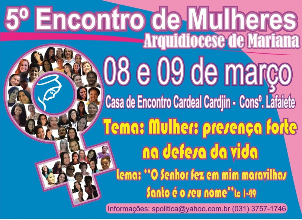 Acontecerá nos dias 08 e 09 de março a 5° edição do Encontro de Mulheres da Arquidiocese de Mariana. Com o tema "Mulher: presença forte na defesa da vida", o evento será realizado na Cassa de Encontro Cardeal Cardjin, na cidade de Conselheiro Lafaiete. Esse ano é proposto a reflexão sobre a defesa da vida à luz do lema "O Senhor fez em mim maravilhas, Santo é o seu nome" (Lc 1,49).