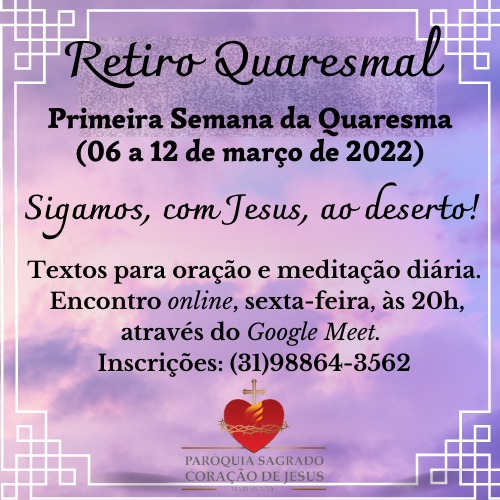 Senhor, quero aprender a não temer os “desertos”. Ajuda-me a mergulhar em mim, a vencer as tentações do maligno. Dá-me lucidez e coragem para conviver com o que é ainda selvagem em meu íntimo; que eu aprenda a domesticar meus desejos, forças e medos. Faça de mim um instrumento do teu amor, da tua misericórdia e solicitude em favor de meus irmãos e irmãs. Que eu seja testemunho vivo, em bem de todos, da presença do teu Reino de vida, verdade e salvação. Amém.