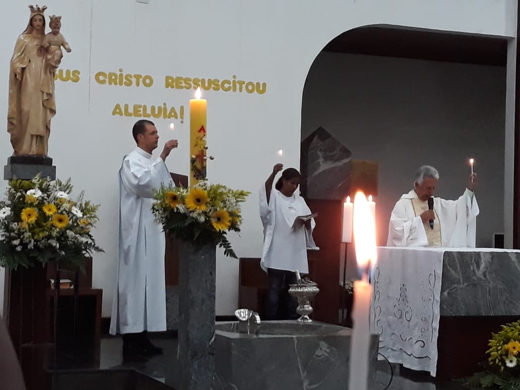 A celebração contou com boa participação da comunidade que veio anunciar e celebrar o Cristo Ressuscitado, nossa luz que vence as trevas. Foi uma celebração solene e alegre, pois celebramos a Missa da Ressurreição, a benção do Fogo Novo e do Círio Pascal, benção da Água Batismal e Renovação das Promessas do Batismo.