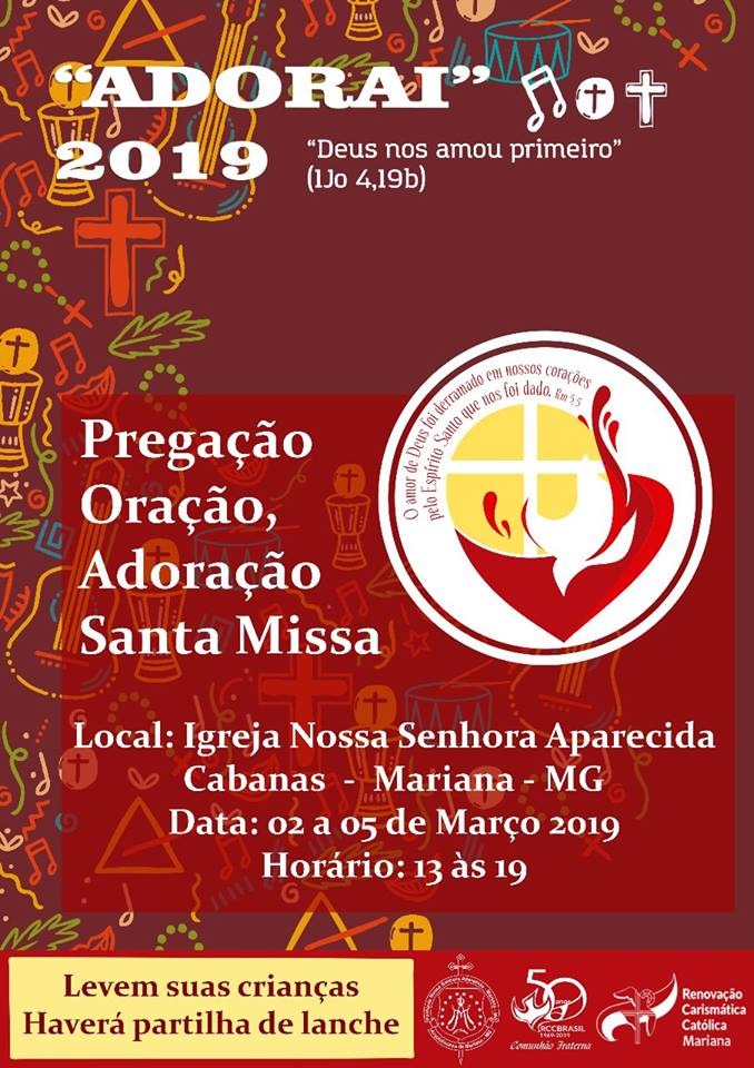 Quer sossego, paz e muita oração no seu carnaval de 2019? A RCC de Mariana promoverá entre os dias 02 e 05 de março, de 13 às 19h, o ADORAI, um retiro de oração fora da agitação dos dias de carnaval. O encontro será realizado na Igreja de Nossa Senhora Aparecida, no bairro Cabanas, em Mariana.