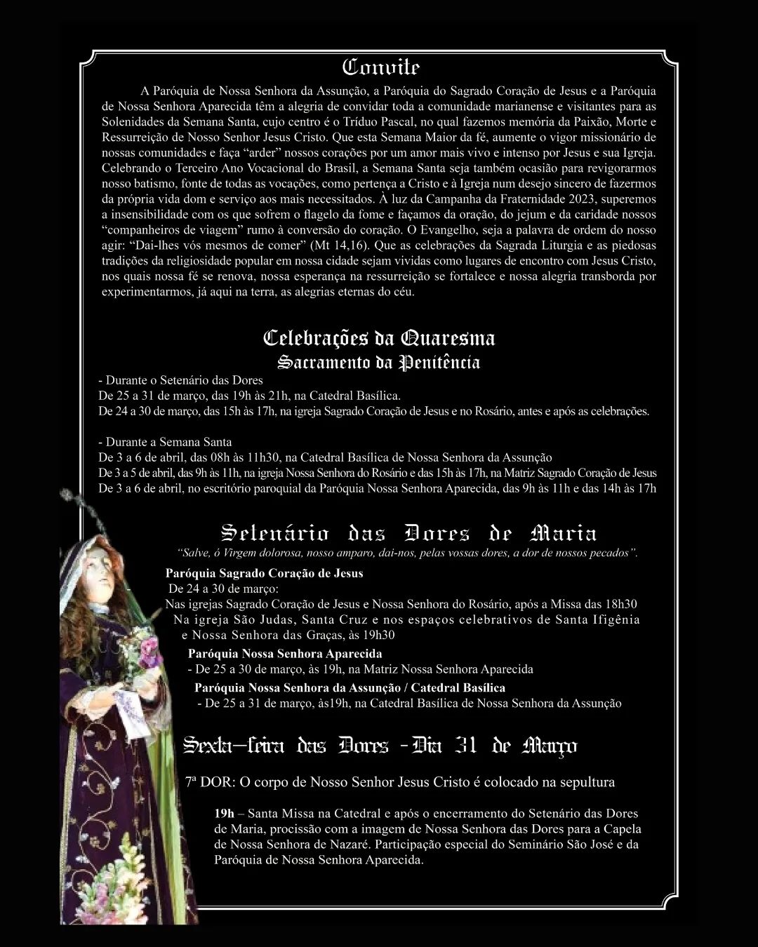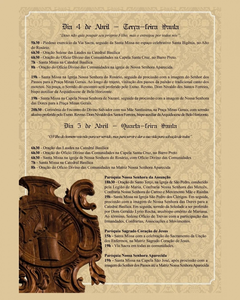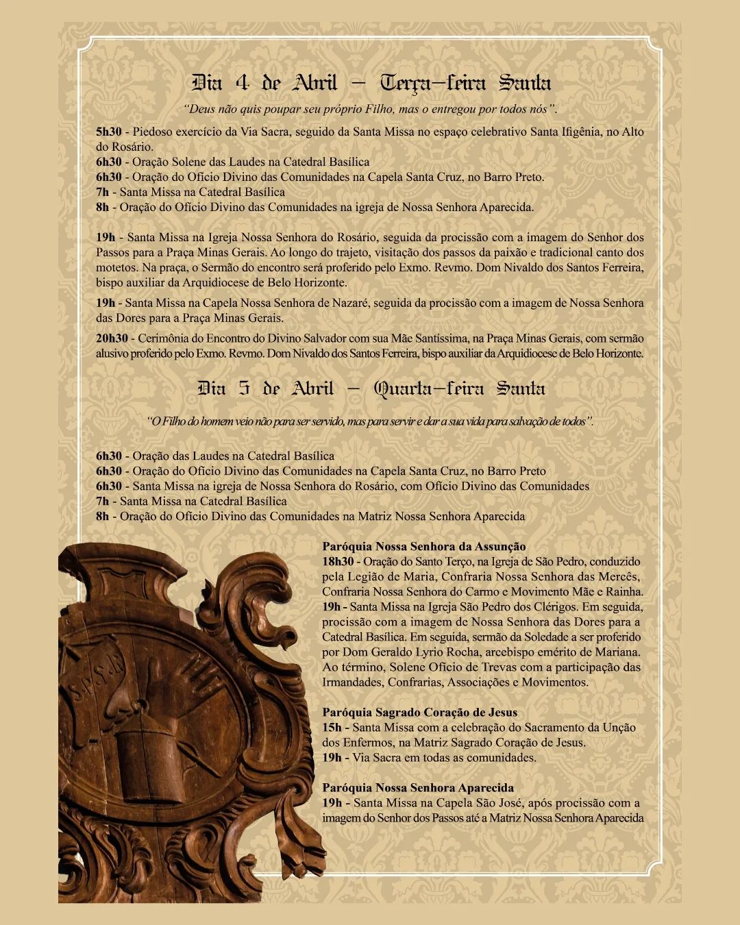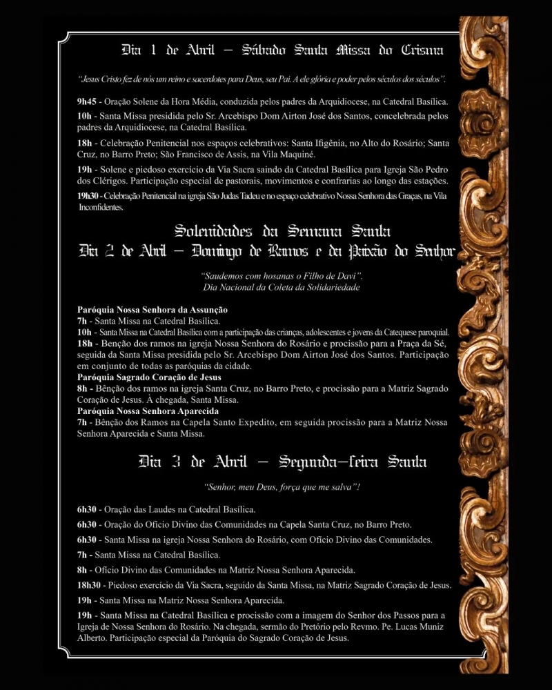 7h30: Concentração e bênção dos Ramos, na Praça de Santa Cruz (Barro Preto), procissão para a Praça dos Ferroviários e missa. (O horário e o local não serão como está no programa da Semana Santa, foram alterados). Traga seu Ramo e participe conosco!