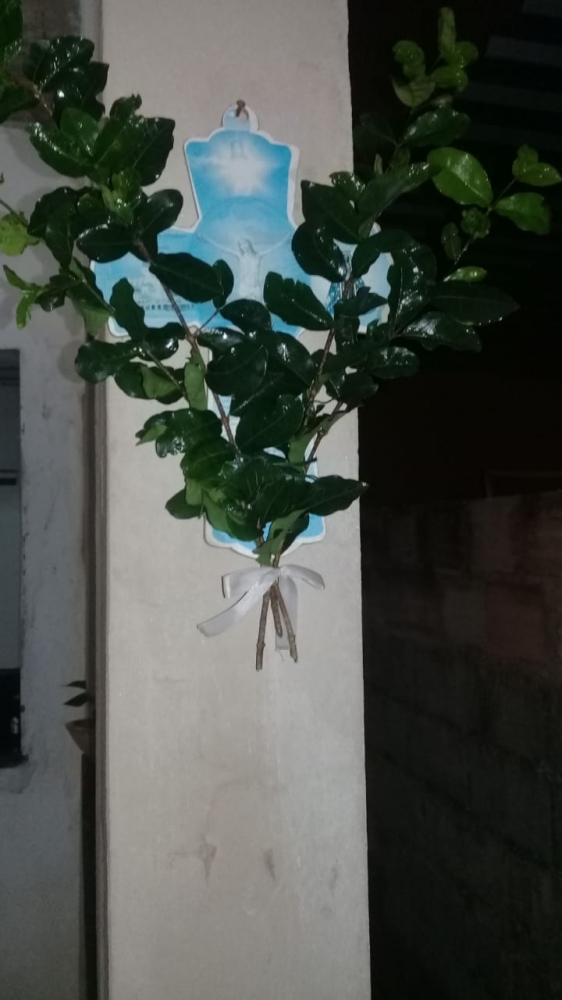 “5 de março foi o dia mais feliz das nossas vidas. Mas eu queria que tivesse a festa da semana santa, mas não foi possível por conta do covid19 . Eu, Sílvio, Maria Isabel, Letícia e Luciana fizemos uma procissão em casa, caminhamos por todos os cantos da casa pegamos ramos, folhas de chá, um caneco com água e rezamos o terço em todos os cantos da casa, foi muito linda a nossa procissão. Silvio com uma cruz com o pano roxo e com a vela acesa, Maria Isabel com a folha de chá bento. Não foi a mesma coisa que fazer com a nossa comunidade , mas o que importa é que conseguimos fazer nossa procissão com muita fé e carinho”